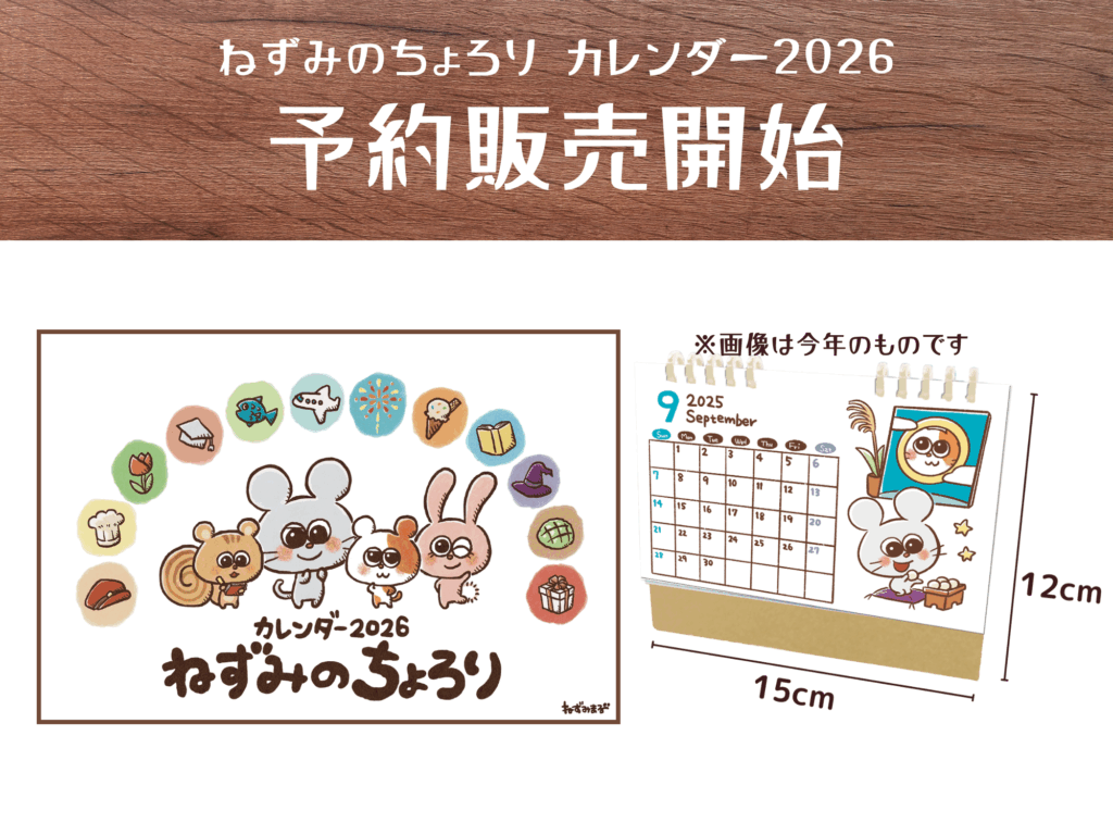 ちょろりファンのみなさま、お待たせいたしました! 毎年大人気の「カレンダー2026 ねずみのちょろり」が、今年も予約販売を開始しました!